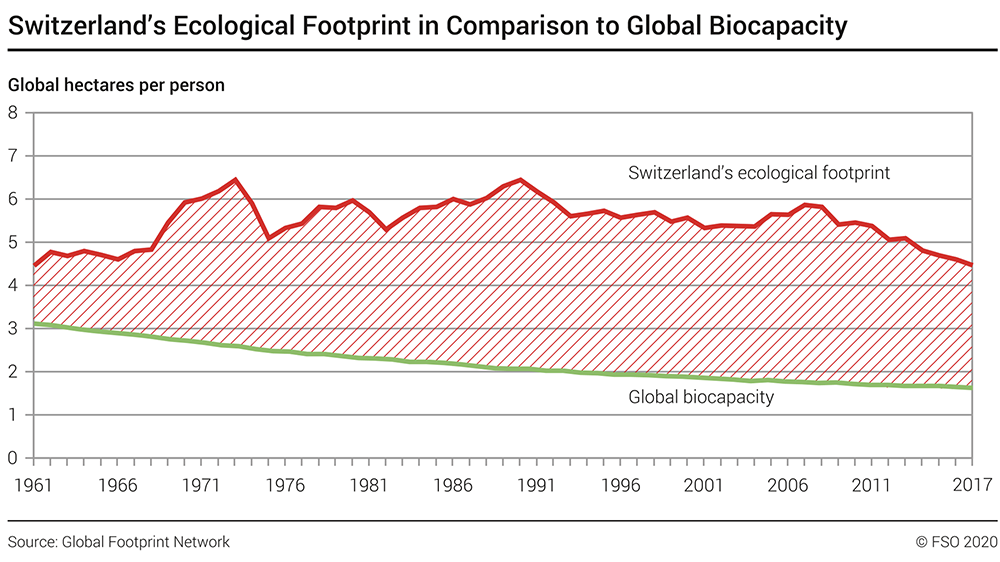Chart 1: Switzerland’s Ecological Footprint in Comparison to Global Biocapacity, Switzerland's Ecological Footprint in Comparison to Global Biocapacity - Global hectares per person - 1961-2017 | Diagram | Federal Statistical Office (admin.ch)