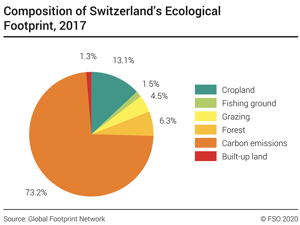 Chart 2: Composition of the Ecological Footprint of Switzerland (2017). Composition of Switzerland's Ecological Footprint - In percent - 2017 | Diagram | Federal Statistical Office (admin.ch)