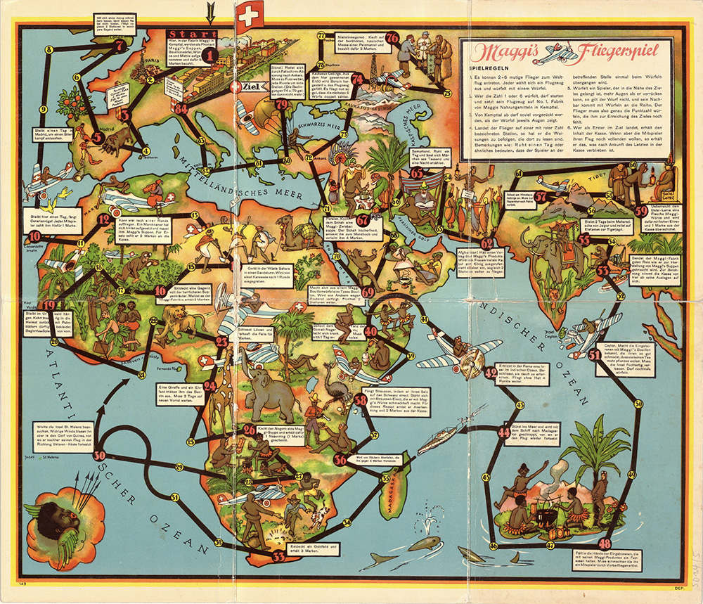Photo 5: Maggi Fliegerspiel [The Maggi flying boardgame], Maggi ldt, 1930-40, 48X55 cm, photo by L. Ciompi, View original. The game illustrates how colonialism was shaping minds in the first half of the 20th century.