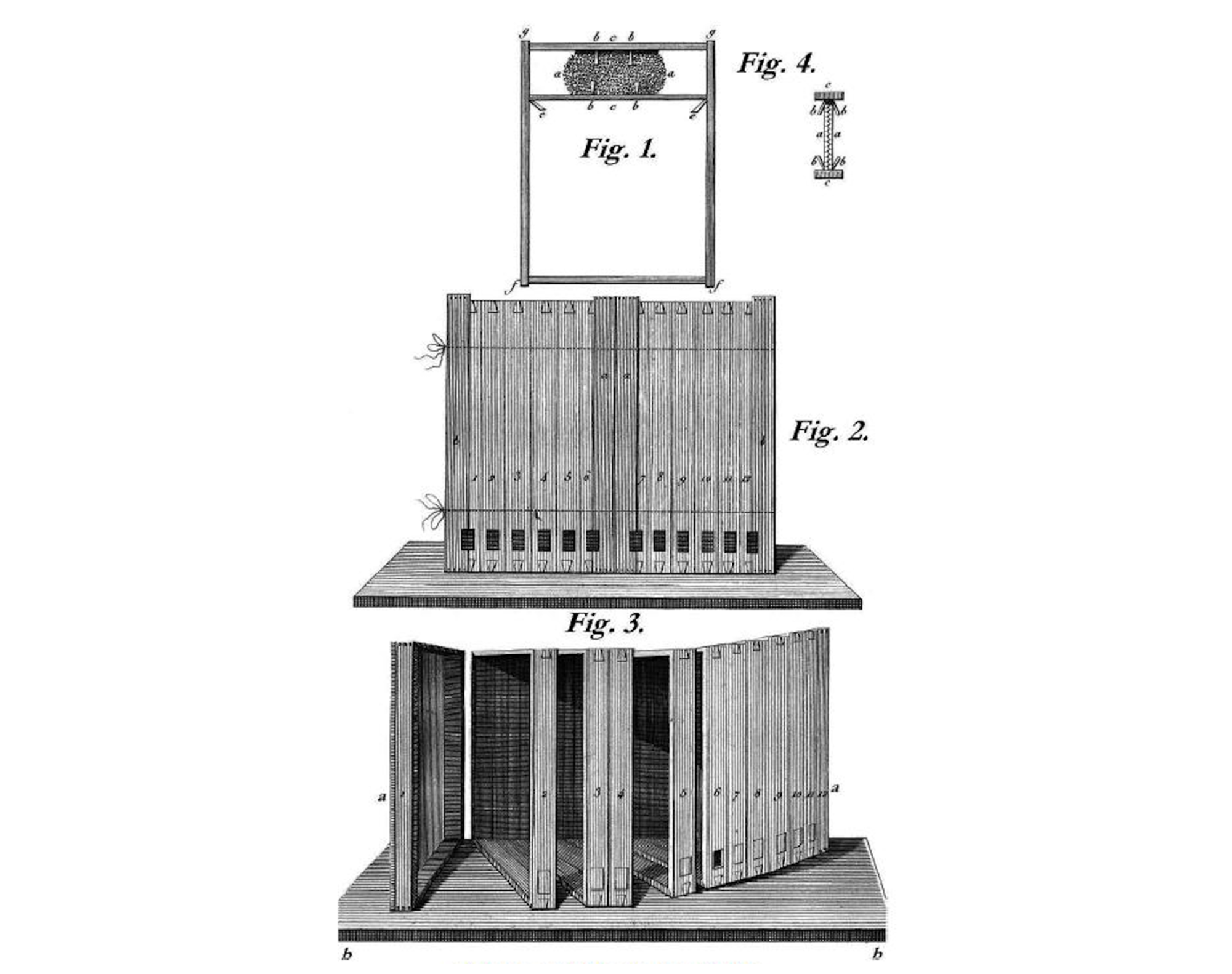 [Picture] François Huber’s model of apiary with horizontal frames for a better extraction of honey, 1814, in: Nouvelles Observations sur les abeilles, adressées à Charles Bonnet, Link to original image, consulted on 9/12/2021.