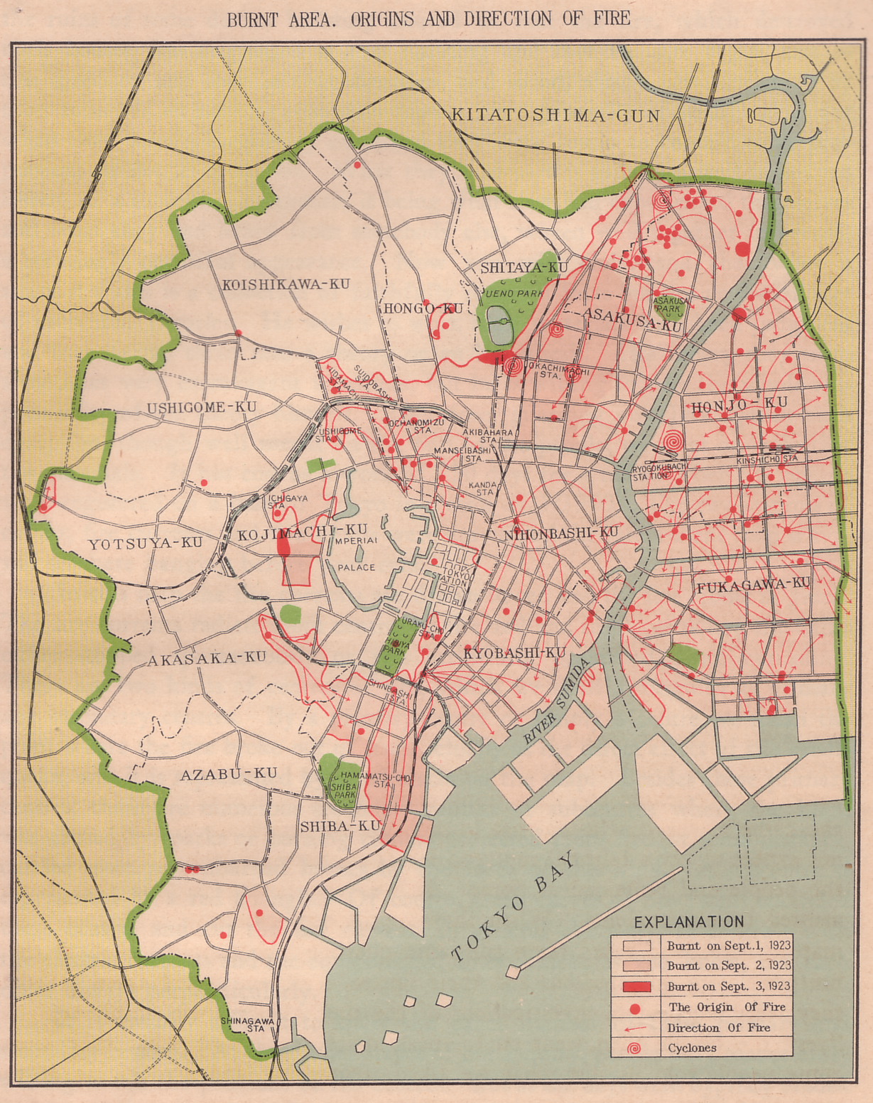 The combination didn’t fail to occur, and many fires started at the locations where a burning stove met flammable material, say collapsed buildings. To make things worse, strong winds blew the day of the tremor and during the three next days, fanning the fires and spreading the flames beyond normal[50]. The strong tempestuous gusts were current due to the seasons of typhoons where storms or strong winds were common. Per say, this disaster was a perfect storm.